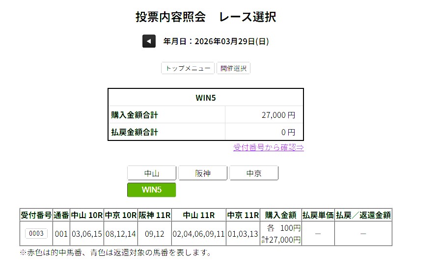 10月26日 270点 ○-○-○-○-○ WIN5達成 9万4970円