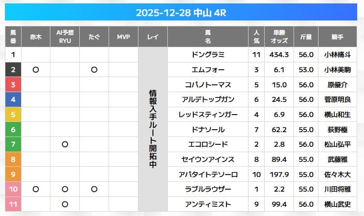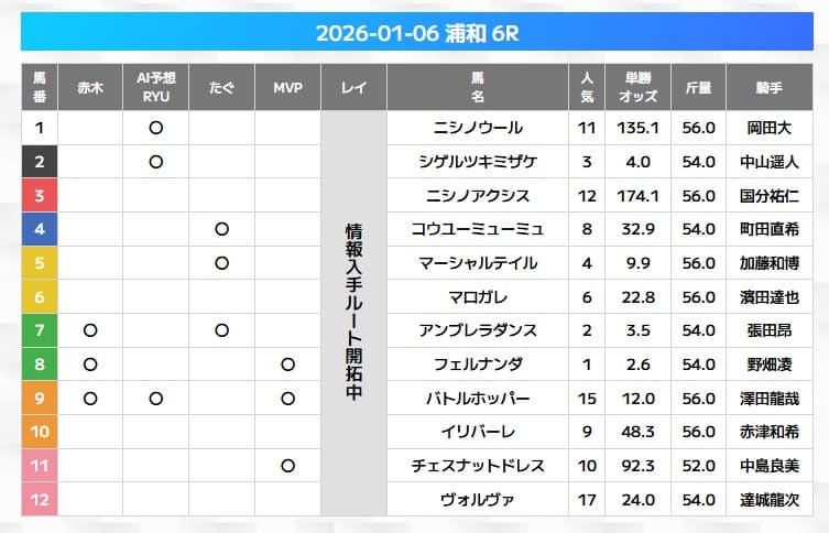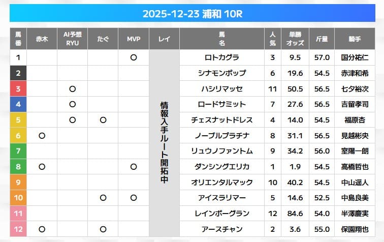 こちらの無料予想は登録するだけで利用可能!平日は毎日4名の競馬予想のプロが厳選した地方競馬の有力馬を12レース分も見ることができます。