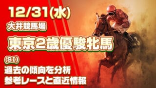 2025年12月31日(水)大井競馬場で開催予定の東京2歳優駿牝馬を競馬ライター蒼井隼が徹底分析!同レースの過去データを収集・分析した結果から傾向や有力馬を解説していきます。最後には蒼井の予想印を公開中。東京2歳優駿牝馬で稼ぎたい方はぜひ参考にして下さい。