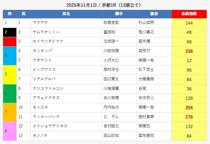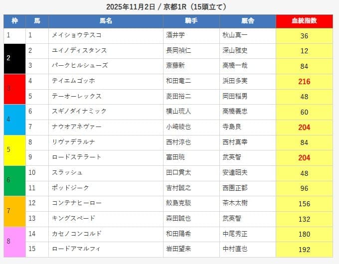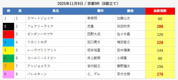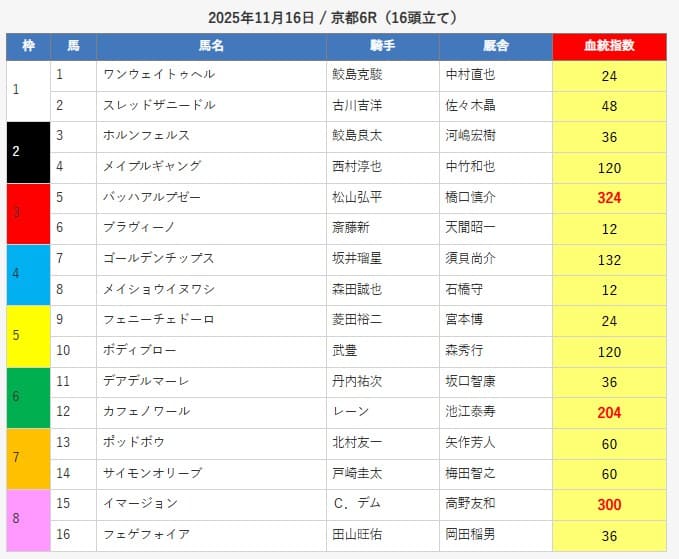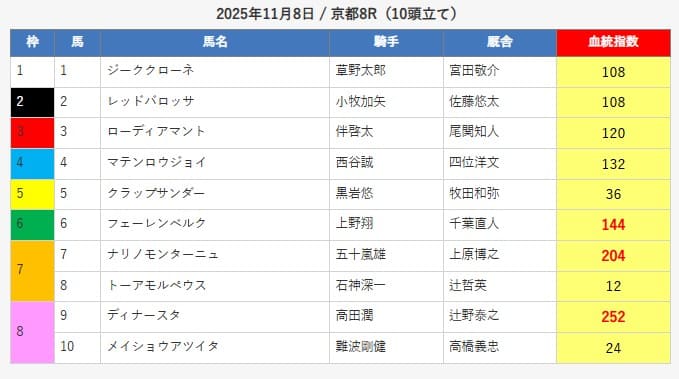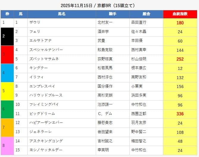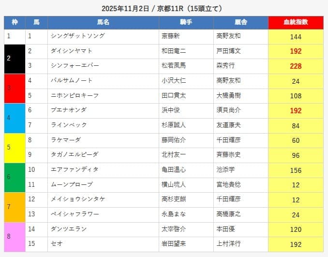 今回の予想で着目すべき点は、8番人気ヨーホーレイクが3番目に指数が高い点でしょう。また、10番人気のエコロヴァルツも3番人気で有力とされるステレンボッシュと同じ数値が付けられています。