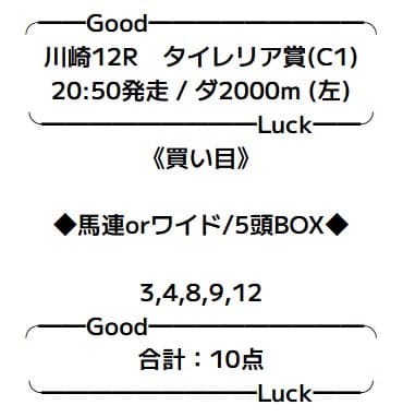 | 2025/08/25 | 川崎10R | ◯ | 2,030円 | 203% |