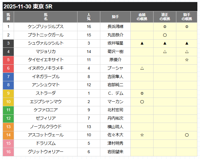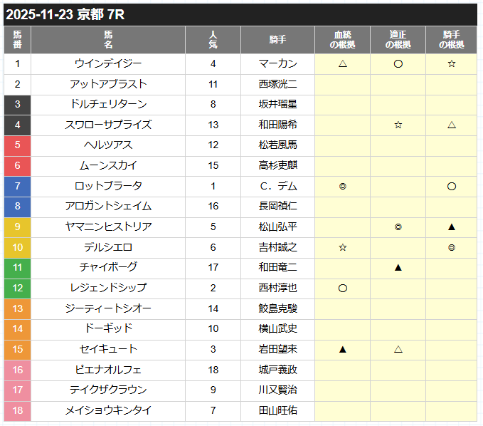 | ▲(単穴) | 能力的に勝ち切る可能性がある穴候補。展開次第で逆転も。 |