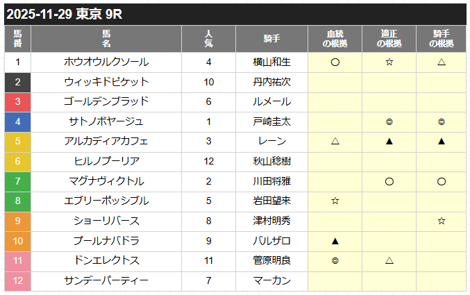 | ◎(本命) | 最も勝つ可能性が高い軸馬。展開・能力ともに信頼度が高い。 |