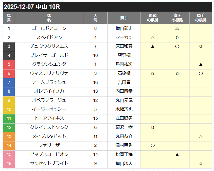 | ☆(穴) | 人気薄の激走候補。はまれば高配当の主役になり得る馬。 |