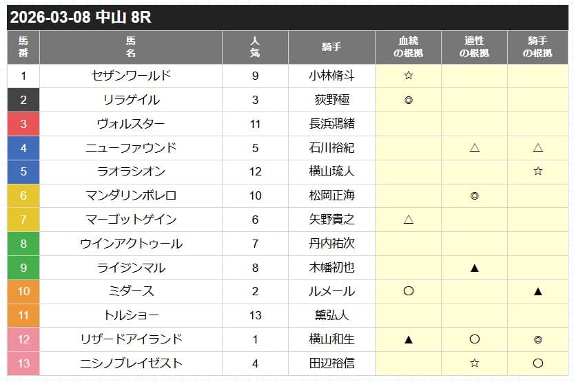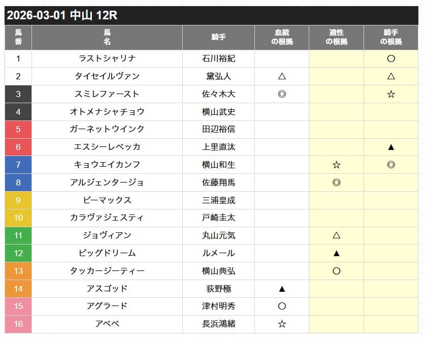| 適性の根拠 | 今回のレース条件がどれだけ合うかを評価する。 |