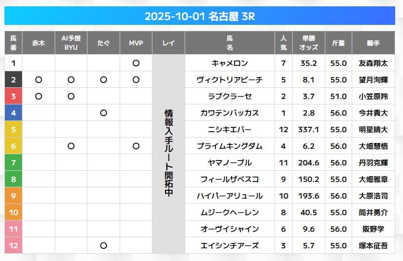 2025年6月27日名古屋3Rを例に上げると、ただ予想印が多い馬を選択して購入するだけで大きく勝ち越すこともできました。