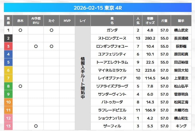 4自分が当たったのは中山2レース目。未勝利戦でこの並びを取り切るのは簡単じゃない。血統的に走る条件が揃った馬を上位に置きつつ、人気を被りすぎたところは冷静に2・3着扱い。 AIの分析をそのまま使うんじゃなく、中央向けにちゃんと取捨しているのが分かる。堅実さと妙味のバランスが良く、コツコツ積み上げたい人にはかなり向いてる。
