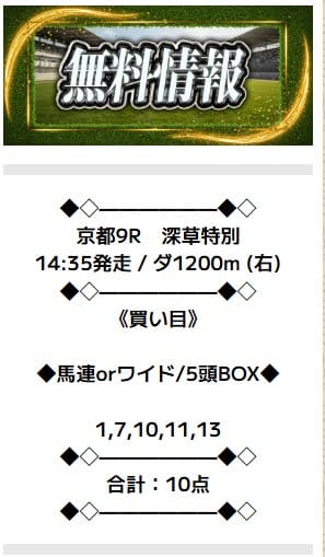 予想は推奨馬が5頭公開され、ワイドか馬連のボックス購入する形式。