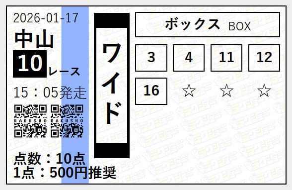 2026年01月17日中山10R ワイド5頭ボックス 60,400円 604%