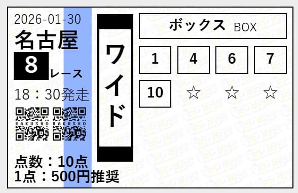 2026年01月30日名古屋R ワイド5頭ボックス 14,800円 148%