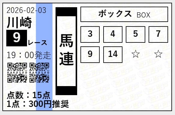 2026年02月03日川崎9R 馬連6頭ボックス 22,700円 151%
