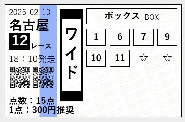 2026年02月13日名古屋12R ワイド6頭ボックス 6,000円 40%