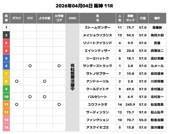 | 予想方法 | AI・馬券師 | AI・馬券師 | AI・馬券師 | AI・馬券師 | AI | 馬券師 | 馬券師 | AI・馬券師 | 馬券師 | AI・馬券師 | AI・馬券師 |
