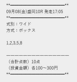 | 2025年9月8日 | 盛岡10R | 〇 | 2,660円 | 266% |
