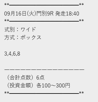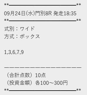 | 2025年9月24日 | 門別8R | 〇 | 1,190円 | 119% |