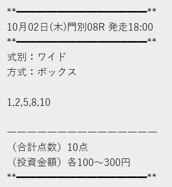 | 2025年10月2日 | 門別8R | △ | 180円 | 18% |