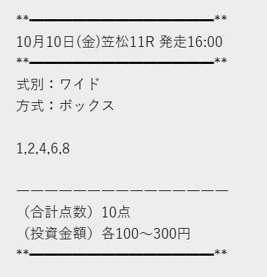 馬券師による予想らしく、買い目が丁寧に組まれていて無駄がありません。感覚に頼らず、地に足のついた予想で信頼できる内容でした。最近流行りのAI予想には驚かされるところもありましたが、やっぱり自分には昔ながらの馬券師が一番です!