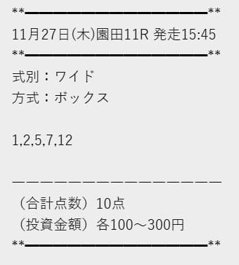 | 2025年11月27日 | 園田11R | 〇 | 1,660円 | 166% |