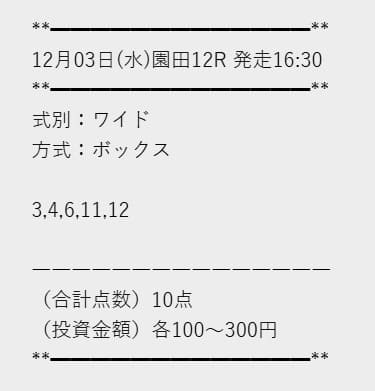 | 2025年12月3日 | 園田12R | 〇 | 1,050円 | 105% |