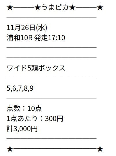 | 2025/11/26 | 浦和10R | △ | 430円 | 43% |