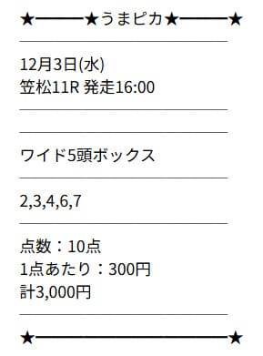 | 2025/12/3 | 笠松11R | △ | 430円 | 43% |