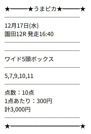 | 2025/12/17 | 園田12R | △ | 970円 | 97% |