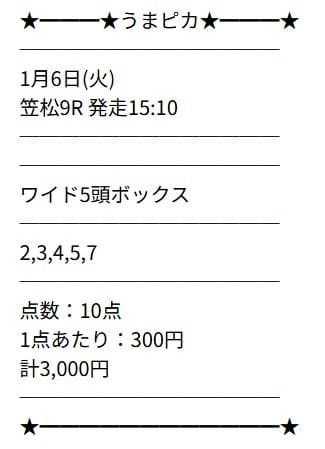 | 2026/1/6 | 笠松9R | △ | 170円 | 17% |